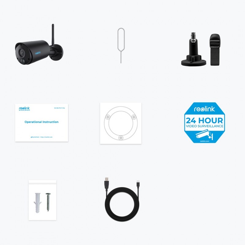 Packaging content1* Argus Series B320-B1* Outdoor Security Mount1* Reset Needle1* Surveillance Sticker1* Mounting Template1* USB-C Cable1* Pack of Screws1* Quick Start Guide