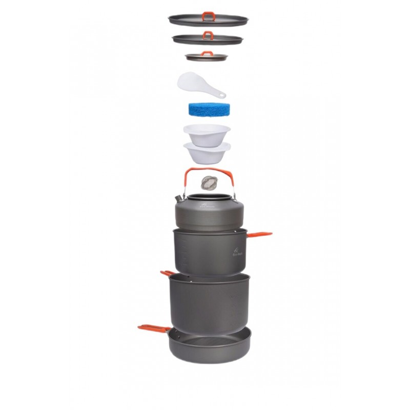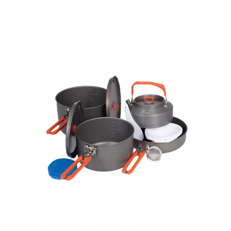 | Set contents | 2 pots with lid, frying pan, kettle, 2 bowls, cooking spatula, tea brewer and sponge |