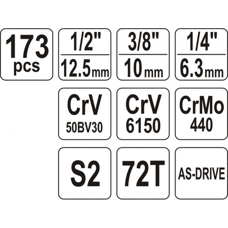 | Set contents | 1/2’ ratchet: 72T, L= 255 mm, 3/8’ ratchet: 72T, 200 mm, 1/4’ ratchet: 72T, 155 mm, sliding knob: 1/2‘; 1/4’, 1/4’ screwdriver knob, L= 150 mm |