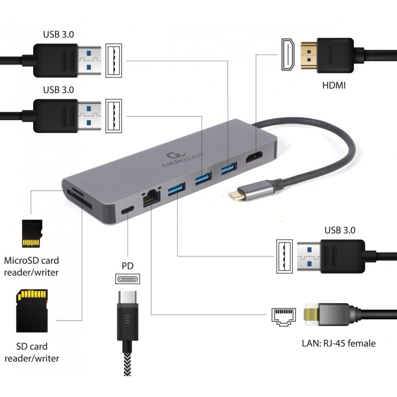 Gembird A-CM-COMBO5-05 USB Type-C 5-in-1 multi-port adapter (Hub + HDMI + PD + card reader + LAN)
